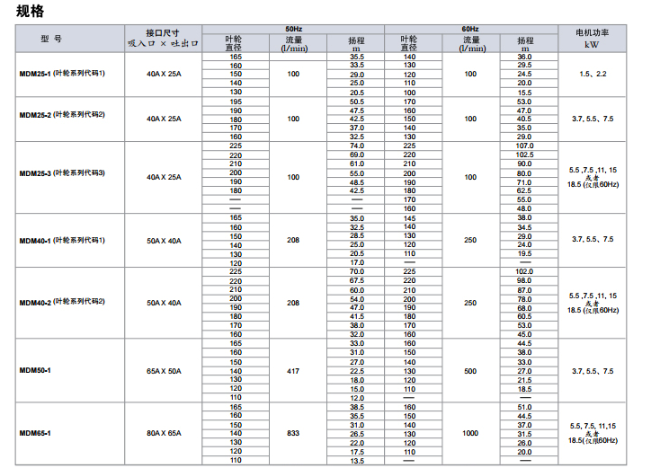 MDM系列新增加了高扬程型号MDM-25-3 及 MDM-40-2, 最高扬程分别可达 74 米(50Hz)及 107 米(60Hz), 扩大了适用范围。